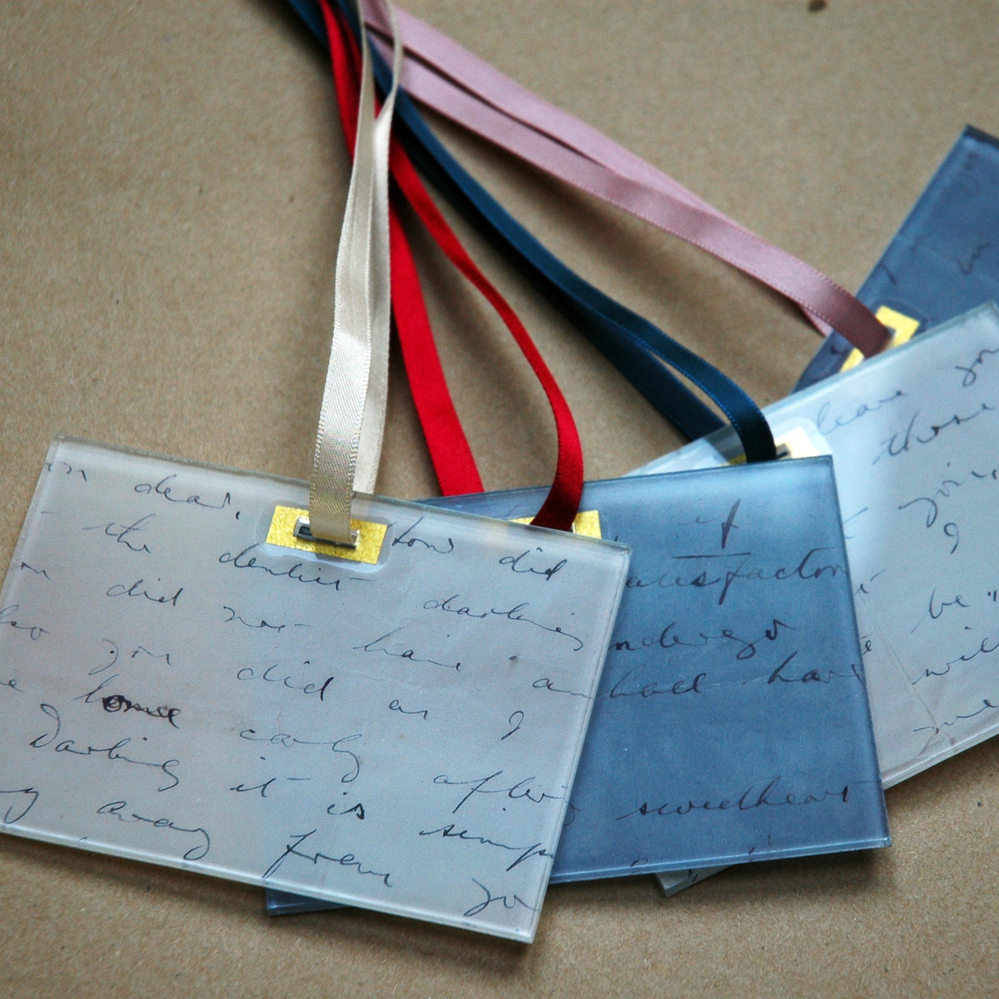 My work includes collections of small envelopes created from original love letters written during World War II. The acrylic valentines shown here use fragments of the letters and hang from coloured ribbons, inspired by the way the original letters were stored.