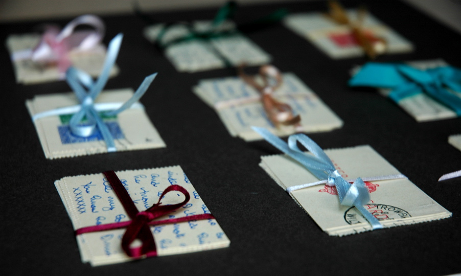 I’ve been commissioned to make a piece using some letter cards written during the 1950s to a young woman based in North Devon. The letter cards are beautifully dainty things and lovely to work with. I used a piece of the original ribbon that the letters were bound in.